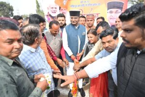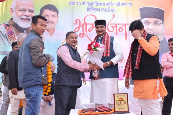 भोपाल, 21 दिसंबर 2025। मध्यप्रदेश शासन के सहकारिता, खेल एवं युवा कल्याण मंत्री एवं नरेला विधानसभा के लोकप्रिय विधायक श्री विश्वास कैलाश सारंग ने रविवार को नरेला विधानसभा अंतर्गत वार्ड क्रमांक 70 स्थित श्री पशुपतिनाथ मंदिर के समीप सड़क निर्माण सहित विभिन्न विकास कार्यों का विधिवत भूमिपूजन कर क्षेत्रवासियों को विकास की कई सौगाते दी। भूमिपूजन अवसर पर पशुपतिनाथ मंदिर परिसर में नेपाली समाज द्वारा मंत्री श्री सारंग का पारंपरिक ढोल-नगाड़ों एवं पुष्पवर्षा के साथ आत्मीय, भव्य एवं ऐतिहासिक स्वागत किया गया। स्वागत से अभिभूत मंत्री श्री सारंग ने समाजजनों का हृदय से आभार व्यक्त किया।