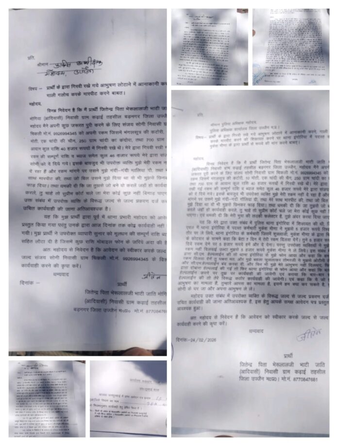 उज्जैन जिले के इंगोरिया थाना क्षेत्र से एक बेहद चौंकाने वाला मामला सामने आया है, जिसमें गिरवी रखे गए आभूषण वापस न मिलने, मारपीट, धमकी और पुलिस कर्मचारियों पर रिश्वत लेने जैसे गंभीर आरोप लगे हैं। पीड़ित ने पूरे घटनाक्रम को लेकर लिखित आवेदन देते हुए न्याय की गुहार लगाई है।