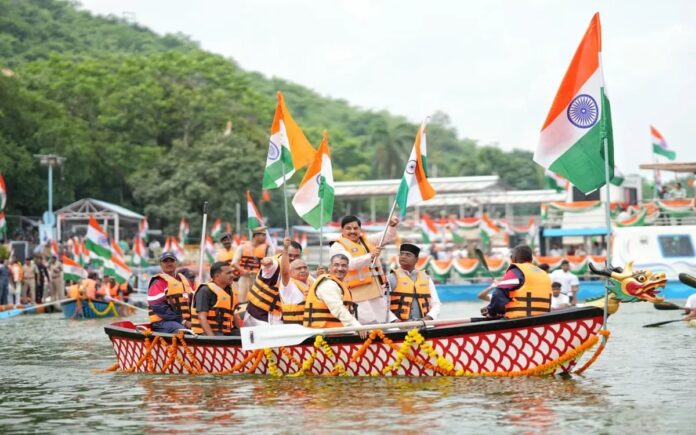 बता दें, बोट क्लब पर नजारा देखने लायक था। सैकड़ों नावों पर सवार लोग हाथों में तिरंगा लिए देशभक्ति के रंग में रंगे दिखाई दिए। चारों ओर बज रहे गीतों ने देखने वालों का उत्साह चरम पर पहुंचा दिया। लोग खुद भी देशभक्ति के गीत गा रहे थे और अन्य लोगों को भी प्रेरणा दे रहे थे। कई लोग हाथों में देशभक्ति के नारों का पोस्टर लिए लोगों को देश-प्रदेश के विकास के लिए प्रेरित कर रहे थे।