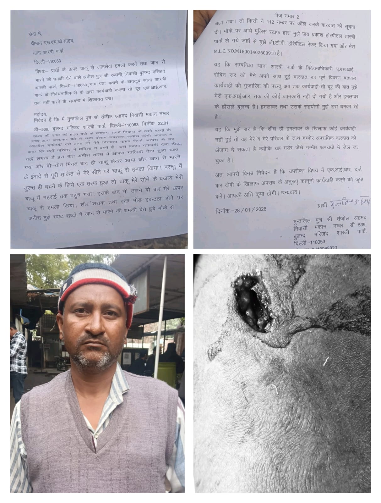 उत्तर-पूर्वी दिल्ली के शास्त्री पार्क इलाके में कानून-व्यवस्था पर गंभीर सवाल खड़े करने वाली एक सनसनीखेज घटना सामने आई है। गाली-गलौज का विरोध करना एक युवक को भारी पड़ गया। आरोप है कि दबंग किस्म के व्यक्ति ने चाकू से जानलेवा हमला कर गंभीर रूप से घायल कर दिया, लेकिन घटना के कई दिन बीत जाने के बाद भी पुलिस ने अब तक एफआईआर दर्ज नहीं की है। इससे पीड़ित परिवार दहशत में है और हमलावर के हौसले बुलंद बताए जा रहे हैं।