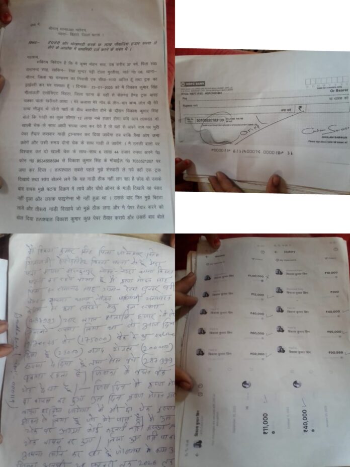 पटना/बिहटा। बिहार के पटना जिले के बिहटा थाना क्षेत्र से सेकेंड हैंड ट्रक खरीदने के नाम पर लाखों रुपये की कथित ठगी का मामला सामने आया है। पश्चिम चम्पारण जिले के निवासी एक ट्रक चालक ने आरोप लगाया है कि ट्रक दिलाने का झांसा देकर उससे 6 लाख 44 हजार रुपये और दो खाली चेक ले लिए गए, लेकिन न तो ट्रक दिया गया और न ही पैसे वापस किए गए। मामले को लेकर पीड़ित ने थाना बिहटा में शिकायत देकर प्राथमिकी दर्ज करने की मांग की है।