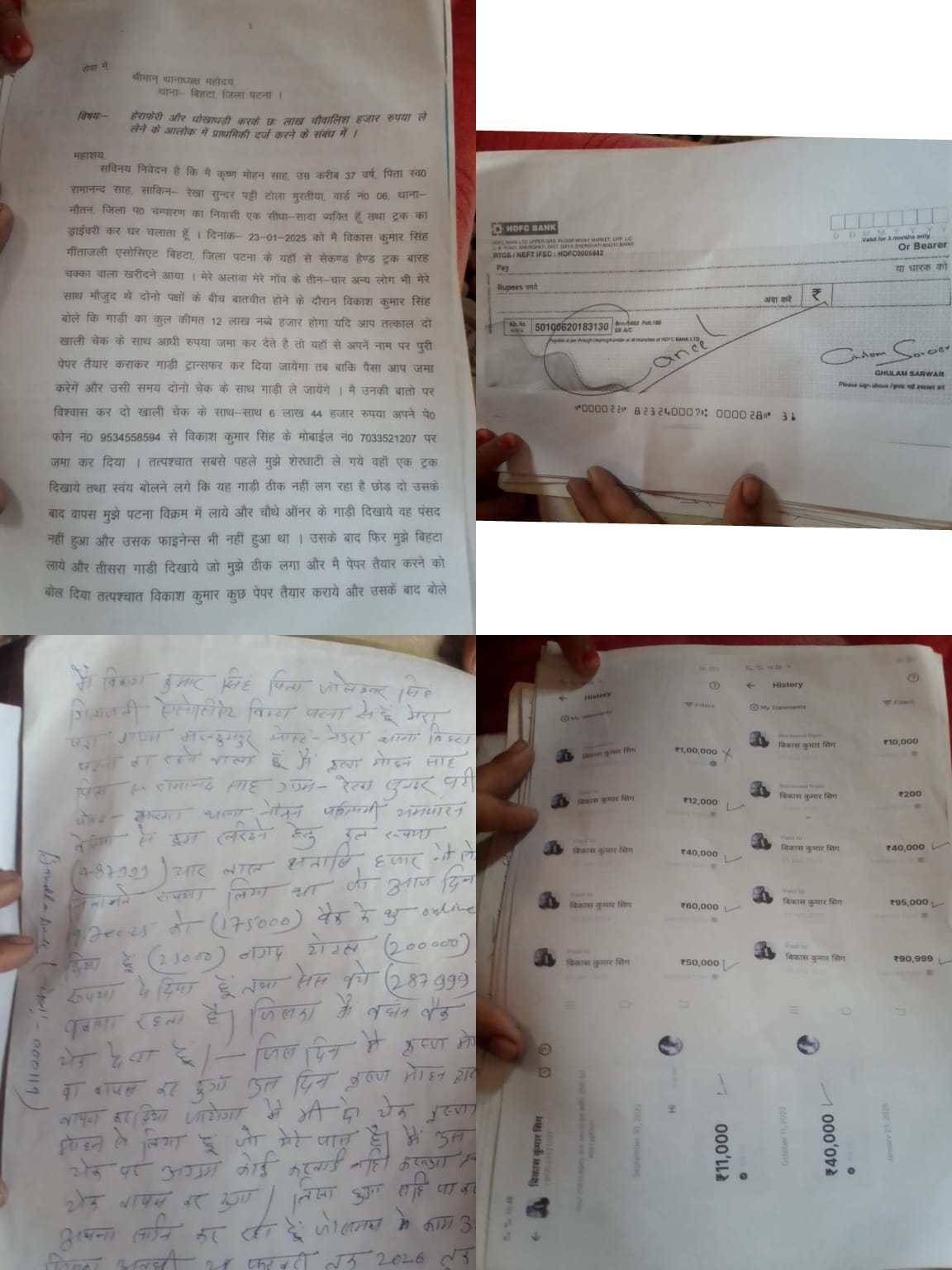 कृष्ण मोहन साह का आरोप है कि विकास कुमार सिंह की बातों पर भरोसा कर उन्होंने अपने साथ आए गांव के लोगों की मौजूदगी में अपने मोबाइल नंबर से ऑनलाइन माध्यम से 6 लाख 44 हजार रुपये विकास कुमार सिंह के मोबाइल नंबर पर ट्रांसफर कर दिए। साथ ही दो खाली चेक भी उन्हें दे दिए। इसके बाद विकास कुमार सिंह उन्हें अलग-अलग जगहों पर ट्रक दिखाने के लिए ले जाने लगे।