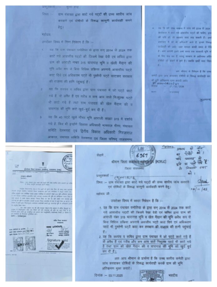 राजस्थान के राजसमन्द जिले में चारागाह भूमि पर कथित पट्टा घोटाले ने प्रशासनिक तंत्र को कठघरे में खड़ा कर दिया है। रेलमगरा उपखण्ड की ग्राम पंचायत पनोतिया में आराजी नम्बर 315, जो राजस्व अभिलेखों में चारागाह और खेल मैदान के रूप में दर्ज है, उस पर वर्ष 2014 से 2024 के बीच आवासीय पट्टे जारी किए जाने का मामला अब जिला मुख्यालय तक पहुंच गया है। शिकायत के बाद कलेक्ट्रेट स्तर पर सतर्कता जांच के आदेश जारी होने से हड़कंप मच गया है।