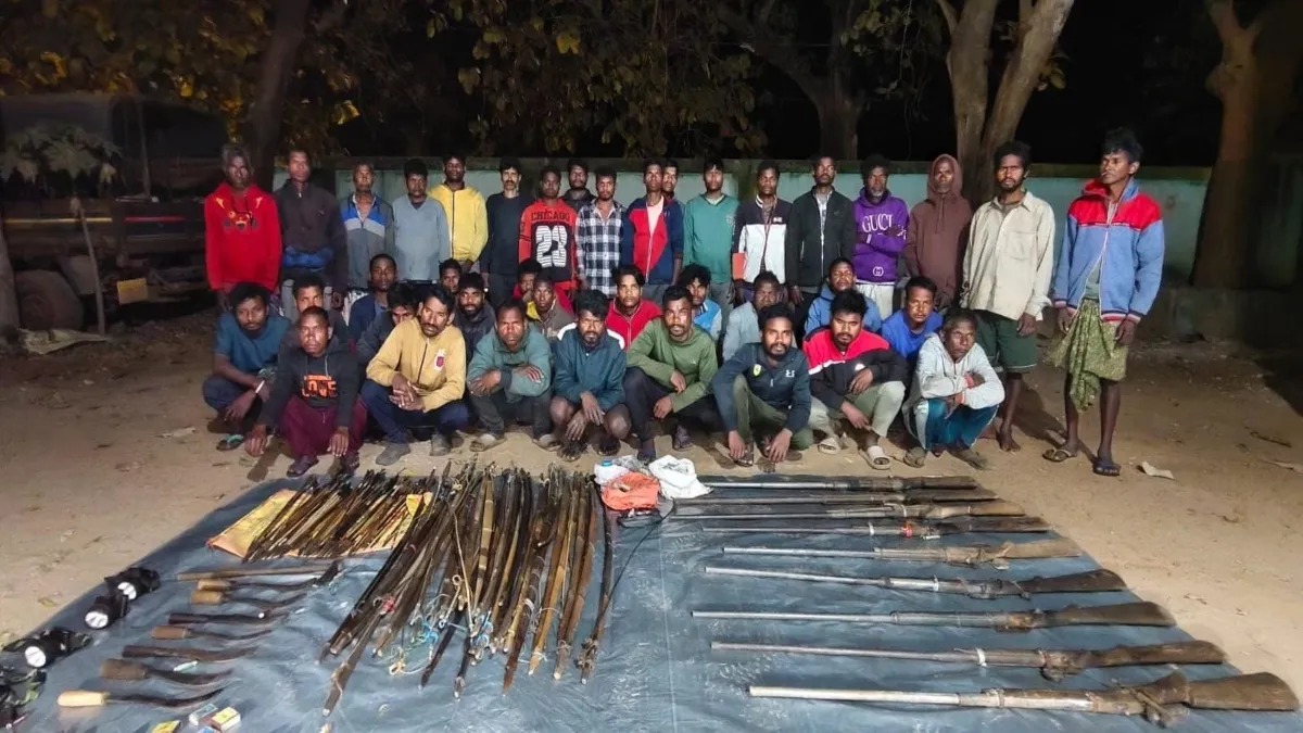 छापेमारी के दौरान आरोपियों के पास से भारी मात्रा में हथियार और विस्फोटक सामग्री बरामद की गई। जब्त सामान में नौ देसी बंदूकें, 20 धनुष, बड़ी संख्या में धारदार हथियार, पर्याप्त मात्रा में विस्फोटक और शिकार में इस्तेमाल होने वाले कई उपकरण शामिल हैं। इससे अंदाजा लगाया जा रहा है कि जंगल में बड़े पैमाने पर शिकार की तैयारी की जा रही थी।