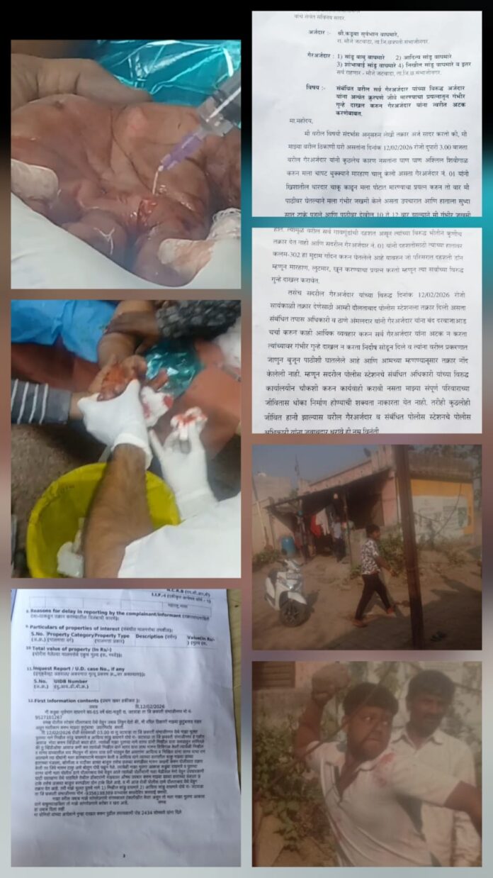 छत्रपति संभाजीनगर। दौलताबाद थाना क्षेत्र के जटवाडा गांव में एक पारिवारिक विवाद ने गंभीर रूप ले लिया और 65 वर्षीय मजदूर कडूबा सूर्यभान वाघमारे पर कथित तौर पर चाकू से जानलेवा हमला किया गया। परिवार ने आरोप लगाया है कि पुलिस शिकायत के बावजूद कोई प्रभावी कार्रवाई नहीं कर रही है, जिससे उनका जीवन खतरे में है।