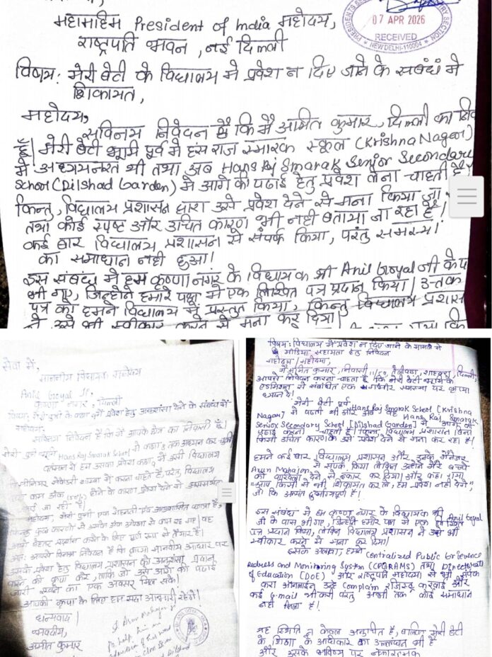 न्याय की उम्मीद में अमित कुमार ने इस मामले की शिकायत केंद्र सरकार के ऑनलाइन पोर्टल CPGRAMS और दिल्ली शिक्षा निदेशालय में भी दर्ज कराई है। इसके अलावा उन्होंने राष्ट्रपति भवन को भी लिखित शिकायत भेजकर हस्तक्षेप की मांग की है। पिता का कहना है कि बेटी का पूरा शैक्षणिक सत्र प्रभावित हो रहा है और समय निकलता जा रहा है, लेकिन अब तक कहीं से भी समाधान नहीं मिल पाया है।