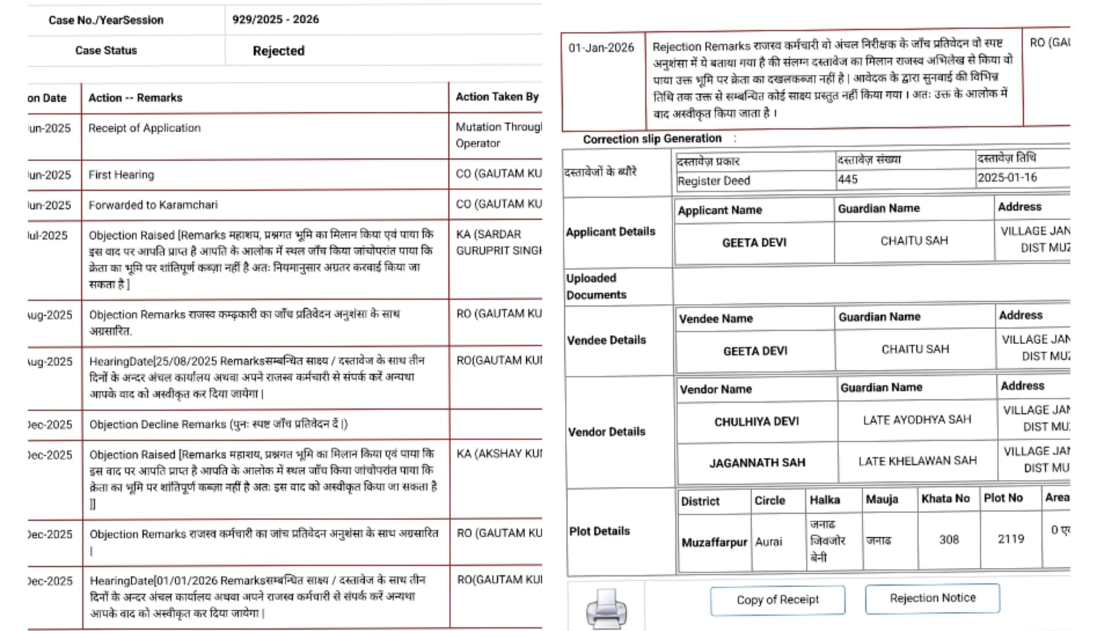 केस संख्या 929/2025-26 में गीता देवी द्वारा दाखिल म्यूटेशन आवेदन को जांच और सुनवाई के बाद अस्वीकृत किया गया। यह भूमि जनाढ़ मौजा, खाता संख्या 308, प्लॉट संख्या 2119 से संबंधित है।