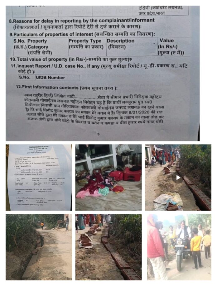 पीड़ित लल्लूराम पुत्र स्वर्गीय मिश्रीलाल, निवासी ग्राम गौरियाकला, कोतवाली गोसाईगंज, जनपद लखनऊ ने बताया कि उनका मकान उनके भाई विनोद कुमार कश्यप के मकान से सटा हुआ है। दिनांक 8 जनवरी 2026 की रात, अज्ञात चोरों ने दोनों मकानों के ताले तोड़कर वारदात को अंजाम दिया और आराम से फरार हो गए।