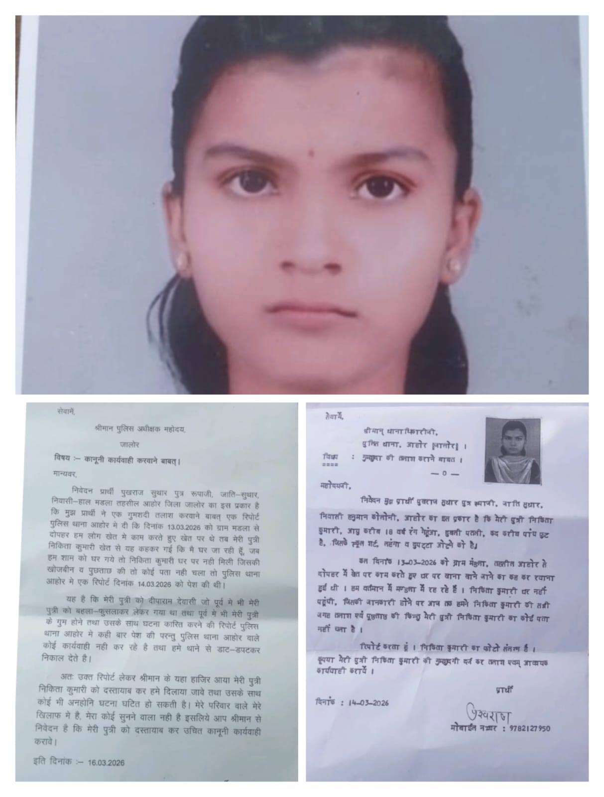 प्राप्त जानकारी के अनुसार, आहोर तहसील के ग्राम मडला निवासी पुखराज सुथार ने पुलिस अधीक्षक को दिए गए प्रार्थना पत्र में बताया कि उनकी पुत्री निकिता कुमारी 13 मार्च 2026 को अचानक लापता हो गई। उस दिन दोपहर के समय परिवार के सदस्य खेत में काम कर रहे थे, तभी निकिता यह कहकर घर के लिए निकली कि वह घर जा रही है। लेकिन जब शाम को परिवार घर पहुंचा तो वह वहां नहीं मिली।