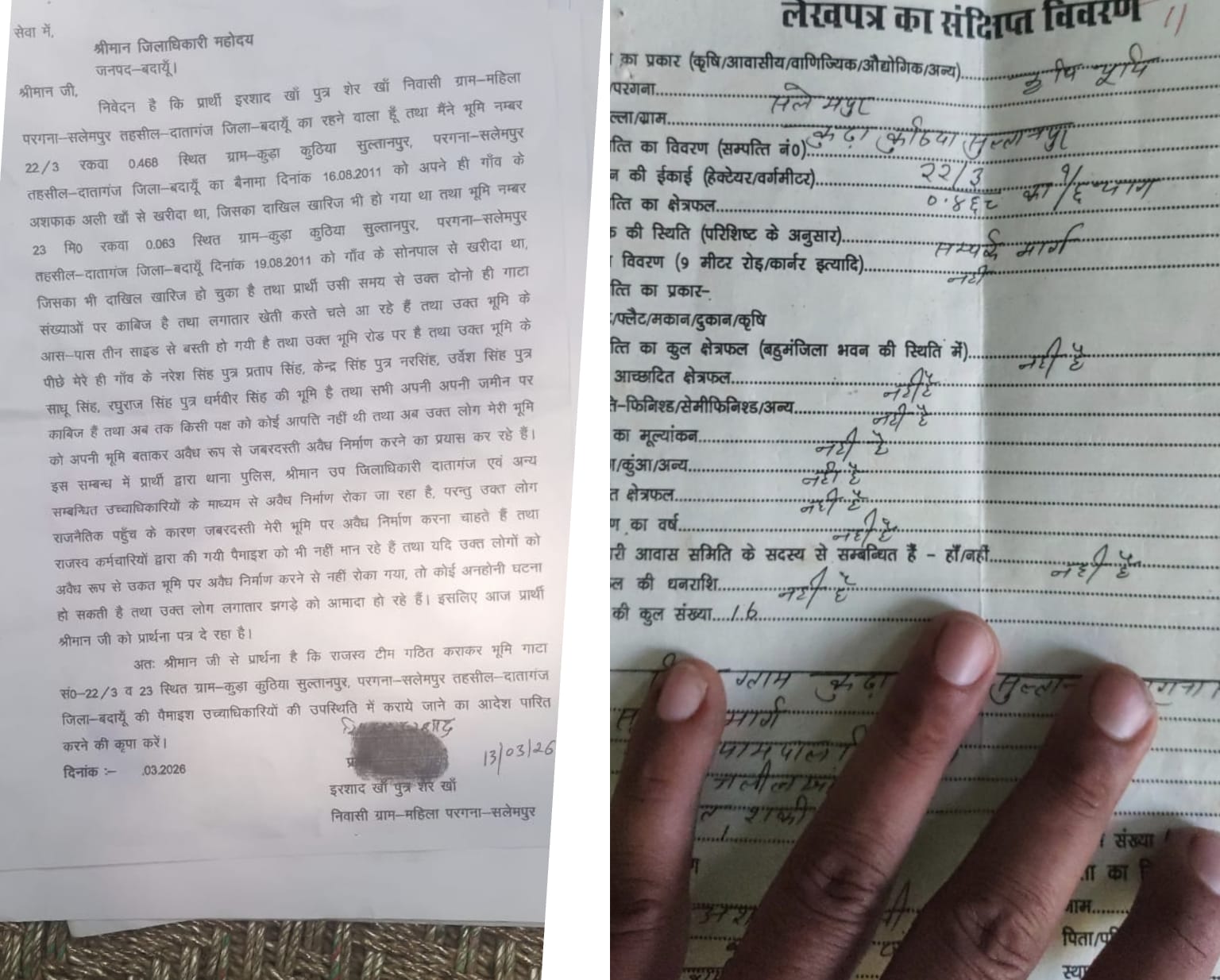 प्राप्त जानकारी के अनुसार, ग्राम महिला परगना सलेमपुर निवासी इरशाद खाँ ने वर्ष 2011 में ग्राम कुड़ा कुठिया सुल्तानपुर स्थित गाटा संख्या 22/3 (रकबा 0.468) और गाटा संख्या 23 (रकबा 0.063) की भूमि विधिवत बैनामा कर खरीदी थी। दोनों ही जमीनों का दाखिल-खारिज भी पूरा हो चुका है और तब से वह लगातार इन पर खेती करते आ रहे हैं।