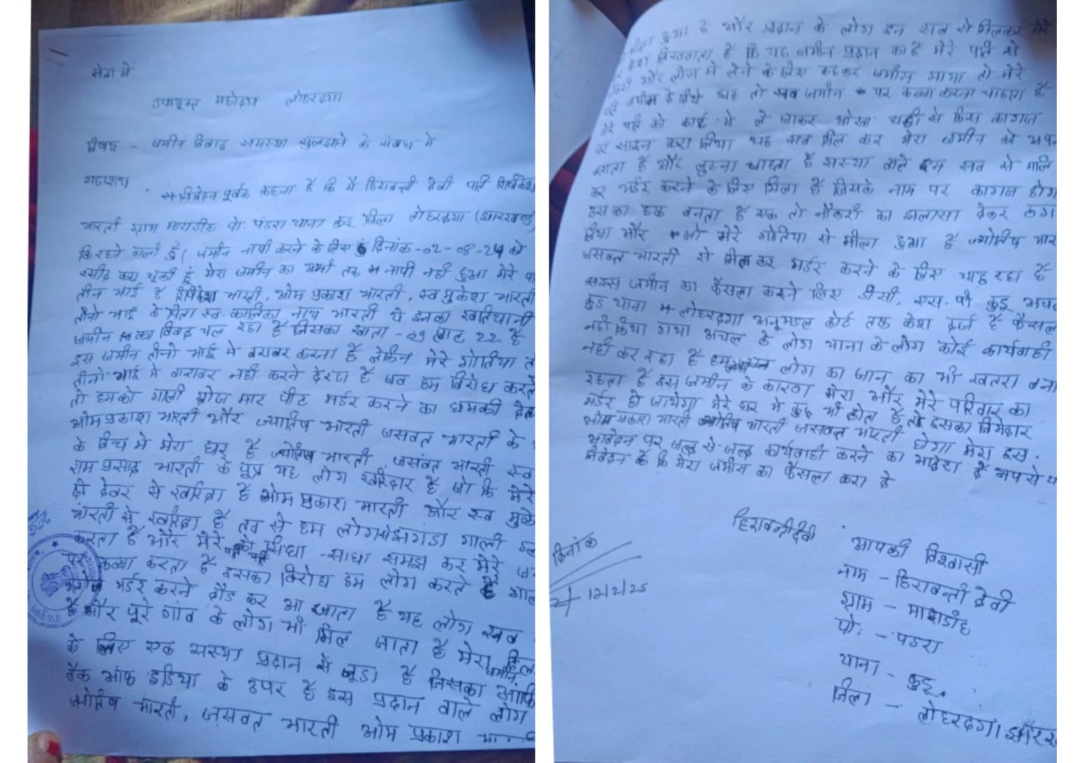 लोहरदगा (झारखंड)। जिले के कुडू थाना क्षेत्र अंतर्गत ग्राम माराडीह की रहने वाली हिरावंती देवी ने अपने ही परिवार और गांव के कुछ लोगों पर गंभीर आरोप लगाते हुए उपायुक्त से न्याय की गुहार लगाई है। मामला पुश्तैनी जमीन के बंटवारे से जुड़ा है, जो अब धीरे-धीरे हिंसक विवाद का रूप लेता जा रहा है। महिला का आरोप है कि जमीन नापी की प्रक्रिया पूरी होने के बावजूद अब तक मापी नहीं कराई गई, जिससे विवाद और गहरा गया है।