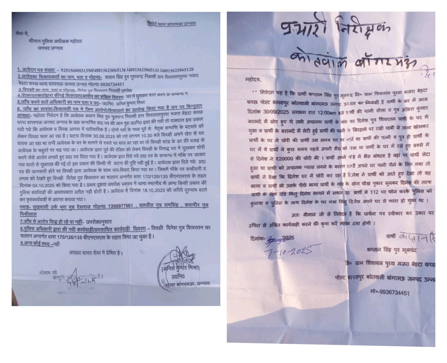 उन्नाव। बांगरमऊ कोतवाली क्षेत्र के शिवलाल पुरवा मजरा बेहटा कच्छ गांव में आधी रात घर में घुसकर हुई चोरी का मामला अब पुलिस की भूमिका को लेकर सवालों के घेरे में है। पीड़ित कप्तान सिंह का आरोप है कि 30 सितंबर 2025 की रात करीब 12 बजे गांव का ही दिनेश पुत्र शिवरतन उनके घर में घुस आया और उनकी पत्नी सीमा व पुत्र अंकित के सिरहाने रखी चाबी से ताला खोलकर बक्से में रखे 20 हजार रुपये चोरी कर लिए। कप्तान सिंह उस समय भैंस के बाड़े ( बंगले ) में सो रहे थे, प्यास लगने पर घर लौटे तो चोर को रंगे हाथ देख लिया। शोर मचाने पर गांव के लोग भी दौड़े, लेकिन आरोपी भागने में सफल रहा। पुलिस को 112 पर सूचना दी गई, पर आरोपी पहले ही फरार हो चुका था।