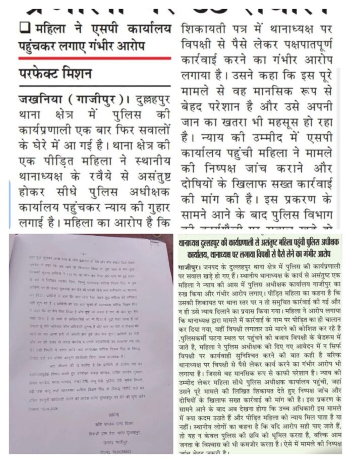 जखनिया गाजीपुर। दुल्लहपुर थाना क्षेत्र में पुलिस की कार्यप्रणाली एक बार फिर सवालों के घेरे में आ गई है। क्षेत्र की एक पीड़ित महिला ने स्थानीय थानाध्यक्ष के रवैये से परेशान होकर सीधे पुलिस अधीक्षक कार्यालय पहुंचकर न्याय की गुहार लगाई है। महिला का आरोप है कि उसकी शिकायत पर थाना स्तर पर न तो कोई प्रभावी कार्रवाई की गई और न ही उसे न्याय दिलाने का प्रयास हुआ। उल्टा कार्रवाई के नाम पर उसका ही चालान कर दिया गया जबकि विपक्षी पक्ष खुलेआम जान से मारने की धमकी दे रहा है।