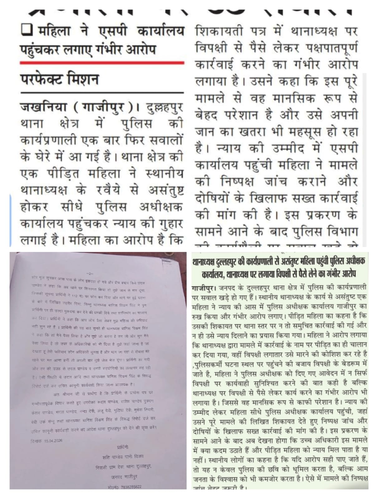 पीड़िता का यह भी आरोप है कि घटना की सूचना देने के बावजूद पुलिस मौके पर पहुंचने के बजाय विपक्षी पक्ष के घर में बैठी रही। इससे आहत होकर महिला ने एसपी को दिए शिकायती पत्र में थानाध्यक्ष पर विपक्षियों से पैसे लेकर पक्षपातपूर्ण कार्रवाई करने का गंभीर आरोप लगाया है। उसने कहा कि इस पूरे मामले से वह मानसिक रूप से बेहद परेशान है और उसे अपनी जान का खतरा भी महसूस हो रहा है।