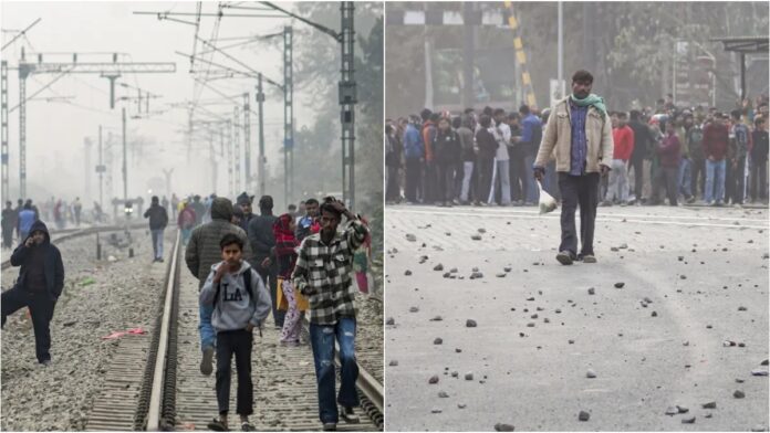 रेलवे ट्रैक पर बैठे गुस्साए लोग