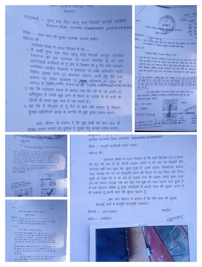 रेलमगरा। क्षेत्र के जगपुरा गांव के रहने वाले आरटीआई कार्यकर्ता मुन्ना शाह ने अपनी जान को गंभीर खतरा बताते हुए उपखण्ड मजिस्ट्रेट रेलमगरा से सुरक्षा देने की मांग की है। दिव्यांग मुन्ना शाह ने आरोप लगाया है कि पंचायत पनोतिया में हुए भ्रष्टाचार और अवैध आवासीय पट्टों के खुलासे के बाद कुछ प्रभावशाली लोग खुली धमकियां दे रहे हैं।