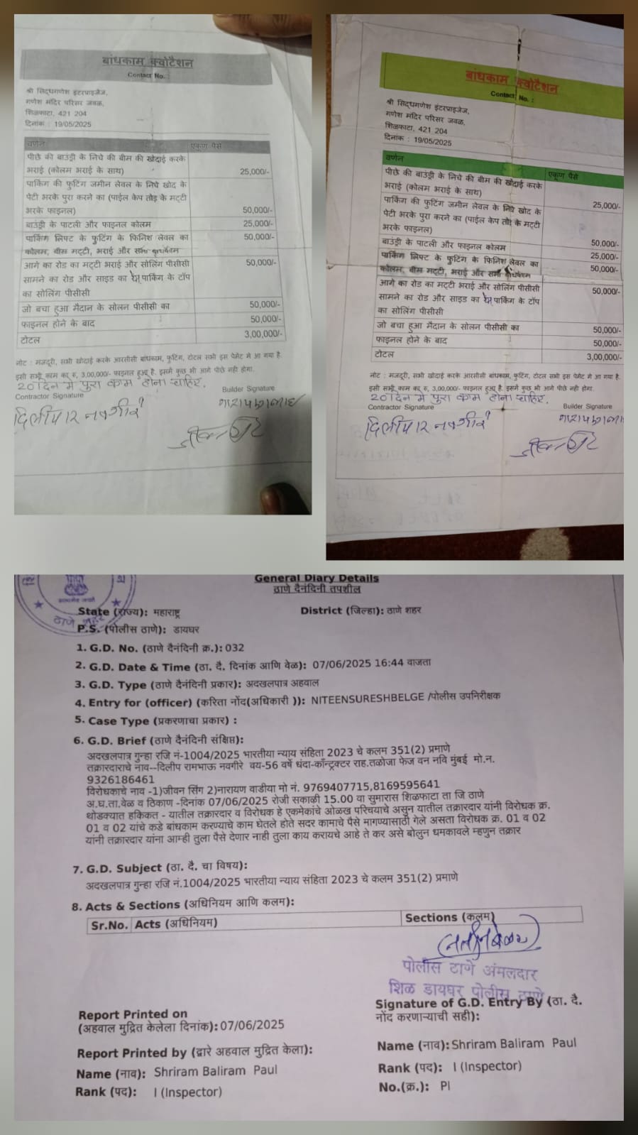 पुलिस में दर्ज रिपोर्ट के अनुसार, ठेकेदार दिलीप नवगीरे ने शिळफाटा क्षेत्र में निर्माण कार्य करने का ठेका लिया था। दोनों पक्षों के बीच 19 मई 2025 को करीब तीन लाख रुपये में निर्माण कार्य का कोटेशन तय हुआ था। इस समझौते के तहत बाउंड्री बीम की खुदाई, पार्किंग की फुटिंग, कॉलम, मिट्टी भराई, पीसीसी और अन्य आरसीसी निर्माण से जुड़े कई काम शामिल थे। ठेकेदार का कहना है कि उसने तय समय में अधिकांश निर्माण कार्य पूरा कर दिया, लेकिन भुगतान की बारी आने पर बिल्डर और उसके सहयोगी ने पैसे देने से इनकार कर दिया।