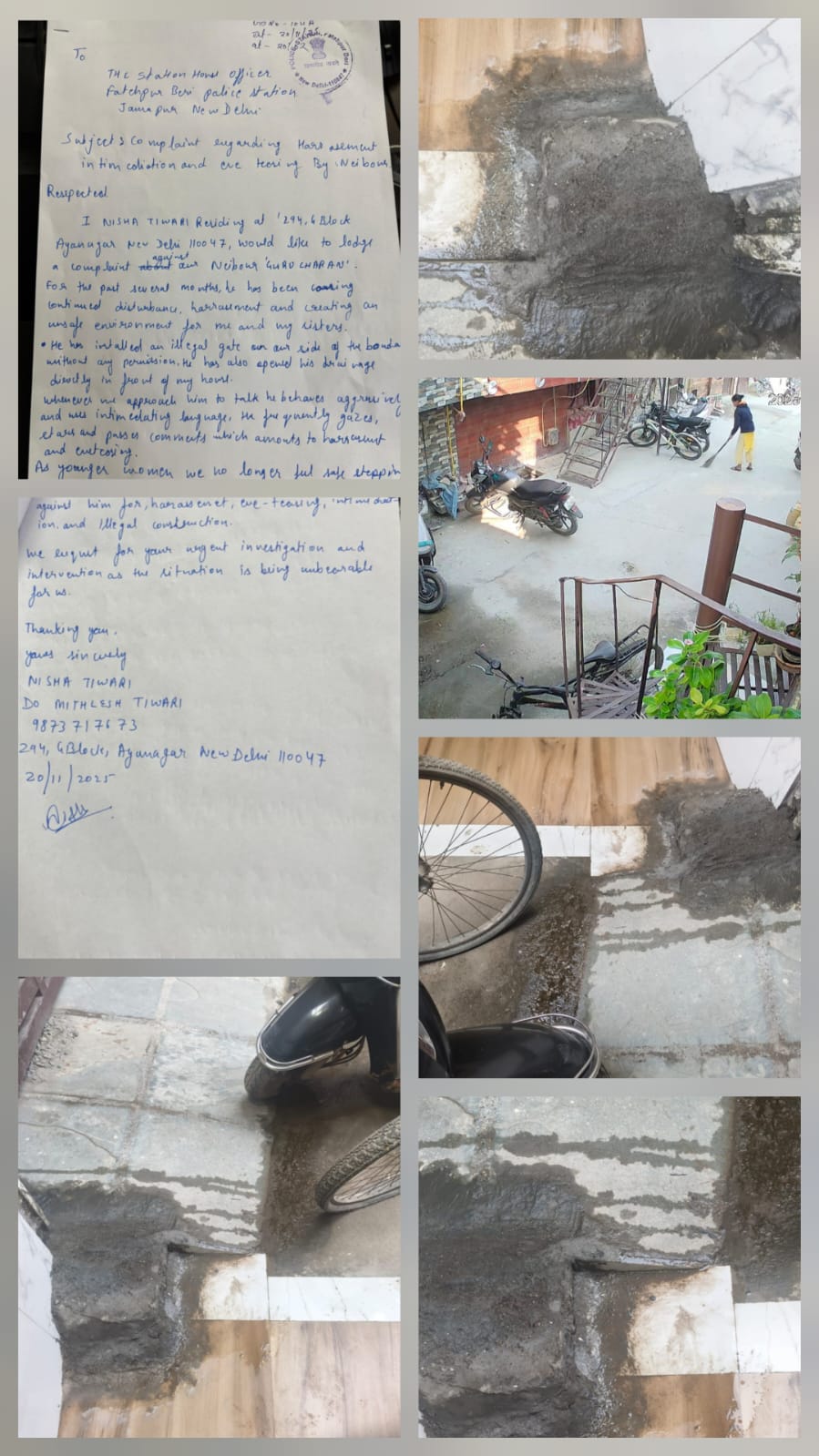 शिकायतकर्ता निशा तिवारी, जो मकान संख्या 294, फेस-6, जी ब्लॉक, अय्यनगर में रहती हैं, ने पुलिस को भेजे पत्र में कहा है कि उनके पड़ोसी द्वारा पिछले कई महीनों से माहौल तनावपूर्ण और असुरक्षित बनाया जा रहा है। उनके अनुसार, आरोपी ने सीमा दीवार (बाउंड्री) के पास बिना अनुमति अवैध गेट लगवाया है, साथ ही नाली का पानी सीधे उनके घर के सामने छोड़ने की व्यवस्था कर दी है।