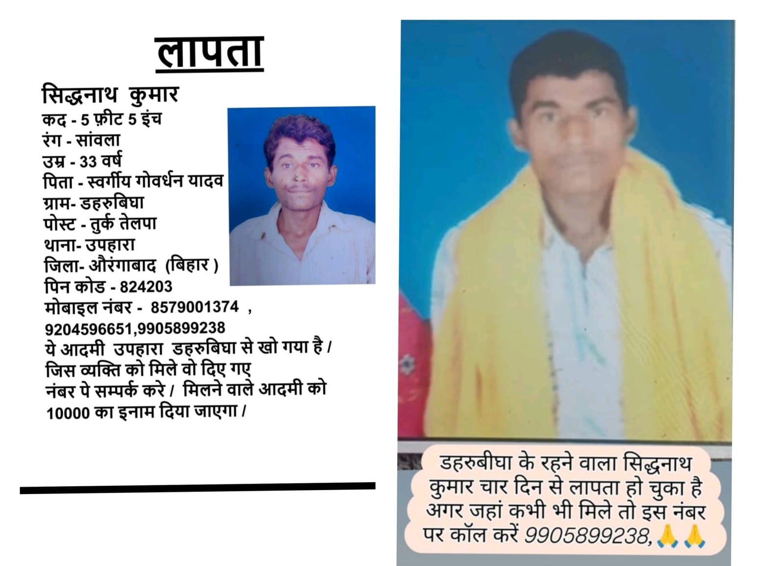 परिजनों ने घोषणा की है कि यदि किसी व्यक्ति को सिद्धनाथ कुमार कहीं भी दिखाई दें या उनके बारे में कोई भी जानकारी मिले, तो तुरंत नीचे दिए गए नंबरों पर संपर्क करें। सही जानकारी देने वाले व्यक्ति को 10 हजार रुपये का नकद इनाम दिया जाएगा।