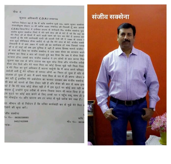 राजधानी लखनऊ से एक चौंकाने वाला मामला सामने आया है, जहां सी.डी.आर.आई. (Central Drug Research Institute) में *कार्यरत एक कर्मचारी पर अपनी ही बहन (रुचि सक्सेना) के पिता का हक* हड़पने और वर्षों पुरानी पारिवारिक संपत्ति को गुपचुप तरीके से बेच देने के गंभीर आरोप लगे हैं। पीड़िता का कहना है कि रिश्तों की आड़ में उसके साथ आर्थिक धोखाधड़ी की गई और आज वह अकेली होकर न्याय की चौखट पर खड़ी है।